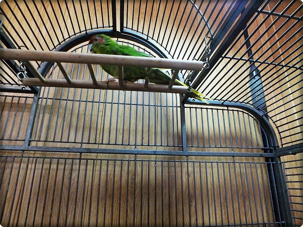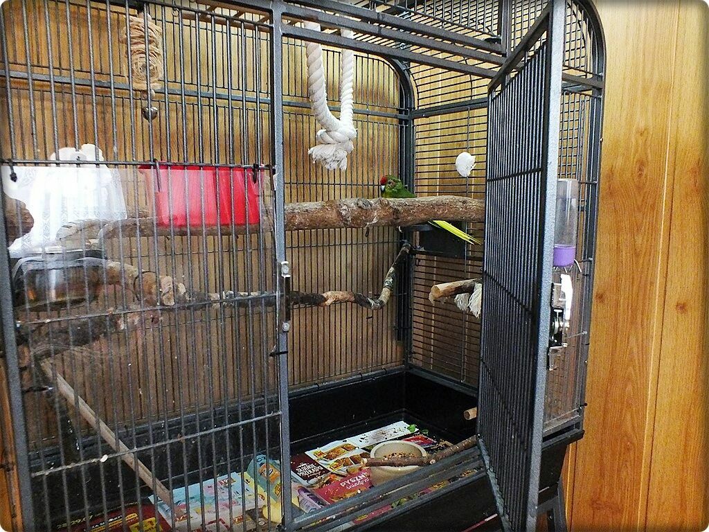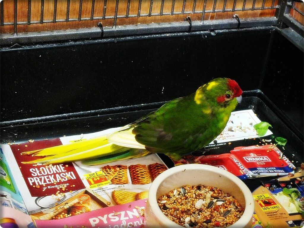 Papużka wychowana w domu. Bardzo lubi być wypuszczany na pokój. Na co dzień mieszka w dużej klatce (widocznej na zdjęciach).